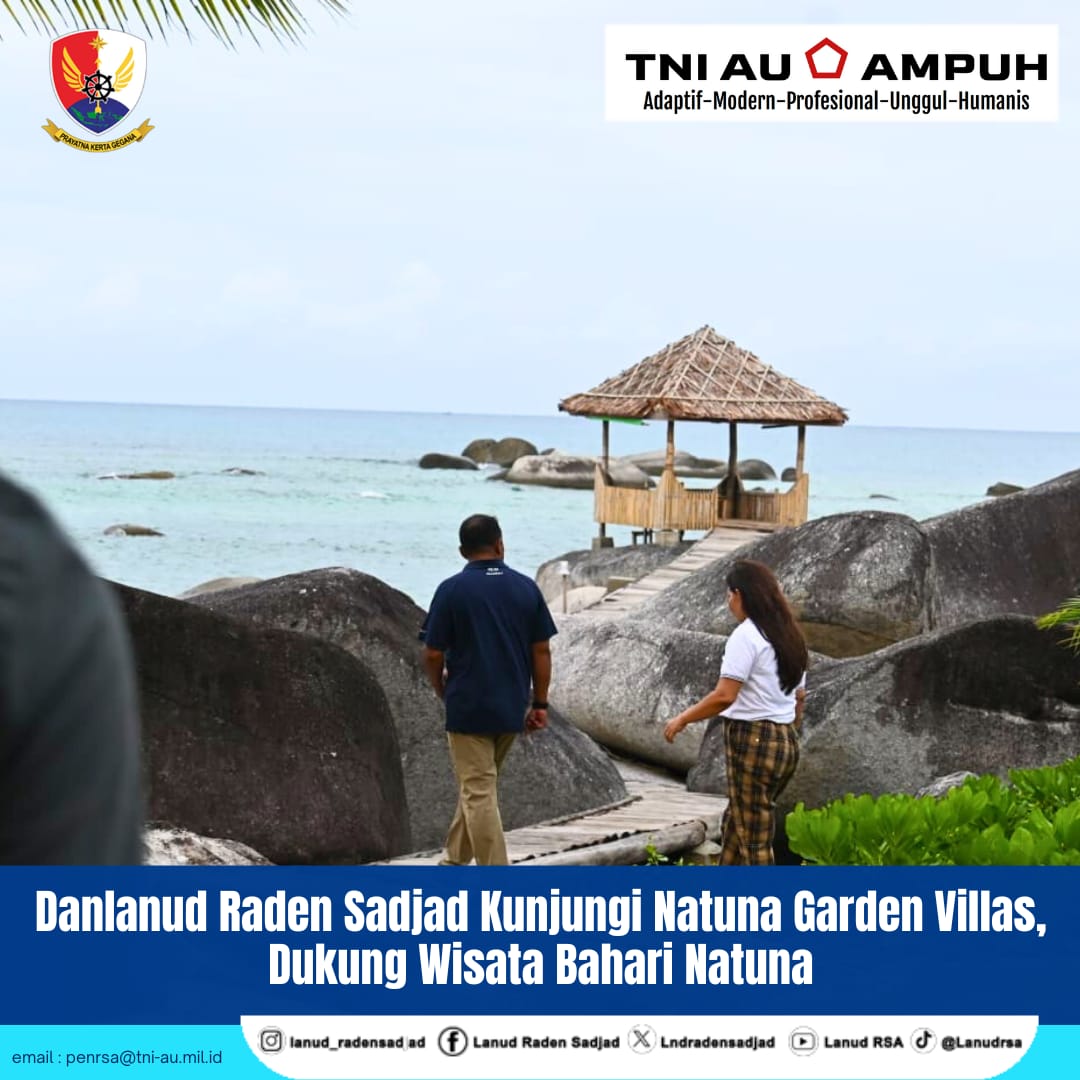 Usai memperkenalkan Rumah Pantai, Danlanud RSA mengajak Sesdisopslatau dan tim menikmati panorama Nirwana Beach, yang terletak di belakang rumah dinas Danlanud, didampingi Kadisops Kolonel Pnb Dion Aridito, S.T., M.M., dan Dansathanlan Mayor Pom Aep Rahmat.