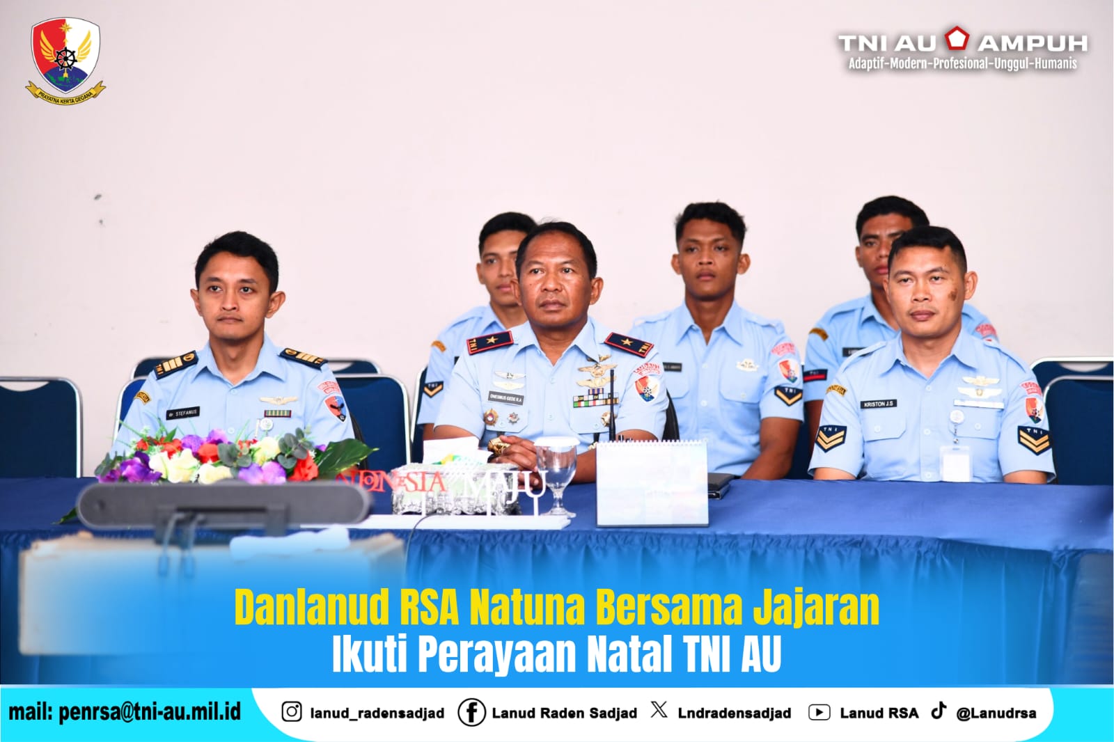 Perayaan Natal TNI AU berlangsung di Gedung Suharnoko Harbani, Mabesau, Jakarta Timur, dan diikuti jajaran satuan melalui video konferensi termasuk jemaat Kristiani di lingkungan Lanud RSA sebagai wujud kebersamaan dalam suasana iman.