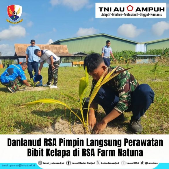 Komandan Lanud Raden Sadjad (Lanud RSA), Kolonel Pnb I Ketut Adiyasa Ambara, memimpin kegiatan perawatan tanaman kelapa jenis Hibrida Genjah Entok dan Kelapa Dalam di RSA Farm dan area Mako Lanud RSA, Jumat (1/8/2025).