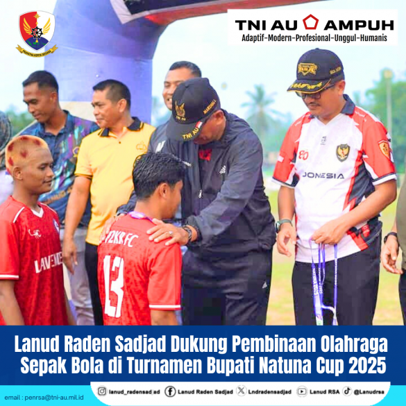 Komandan Lanud Raden Sadjad (RSA) Marsekal Pertama TNI Onesmus Gede Rai Aryadi, S.E., M.M., M.Han., diwakili Kadister Lanud RSA Kolonel Adm Marshall, M.Si., dan Kadispers Letkol Adm Yuli Afrizan, S.Sos., menghadiri final Turnamen Sepak Bola Bupati Natuna Cup 2025 di Lapangan Tunas Harapan Baru, Kecamatan Bunguran Timur, Kabupaten Natuna, Provinsi Kepri, Sabtu (8/11/2025).