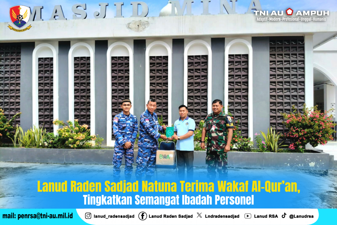 Komandan Lanud Raden Sadjad (Danlanud RSA) Natuna Marsekal Pertama TNI Onesmus Gede Rai Aryadi, S.E., M.M., M.Han., diwakili Kadister Kolonel Adm Marshall, M.Si., menerima 140 mushaf Al-Qur’an dari (BWA) Indonesia di Masjid Mina Lanud RSA, Kabupaten Natuna, Provinsi Kepulauan Riau, Rabu (18/2/2026).