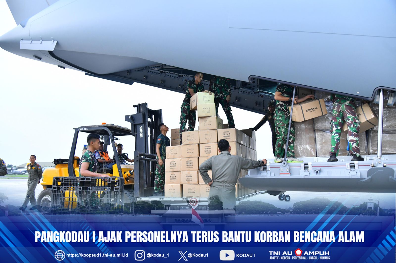 Pangkodau I Marsda TNI Muzafar, S.Sos., M.M., mengatakan, personel Kodau I harus memiliki semangat Abhibhuti Reksa Bhuvana yang memiliki makna, “Keunggulan menjaga, melindungi, dan memelihara alam semesta”, oleh karena itu khususnya Lanud-Lanud yang terkait, teruslah membantu masyarakat yang ditimpa bencana alam.