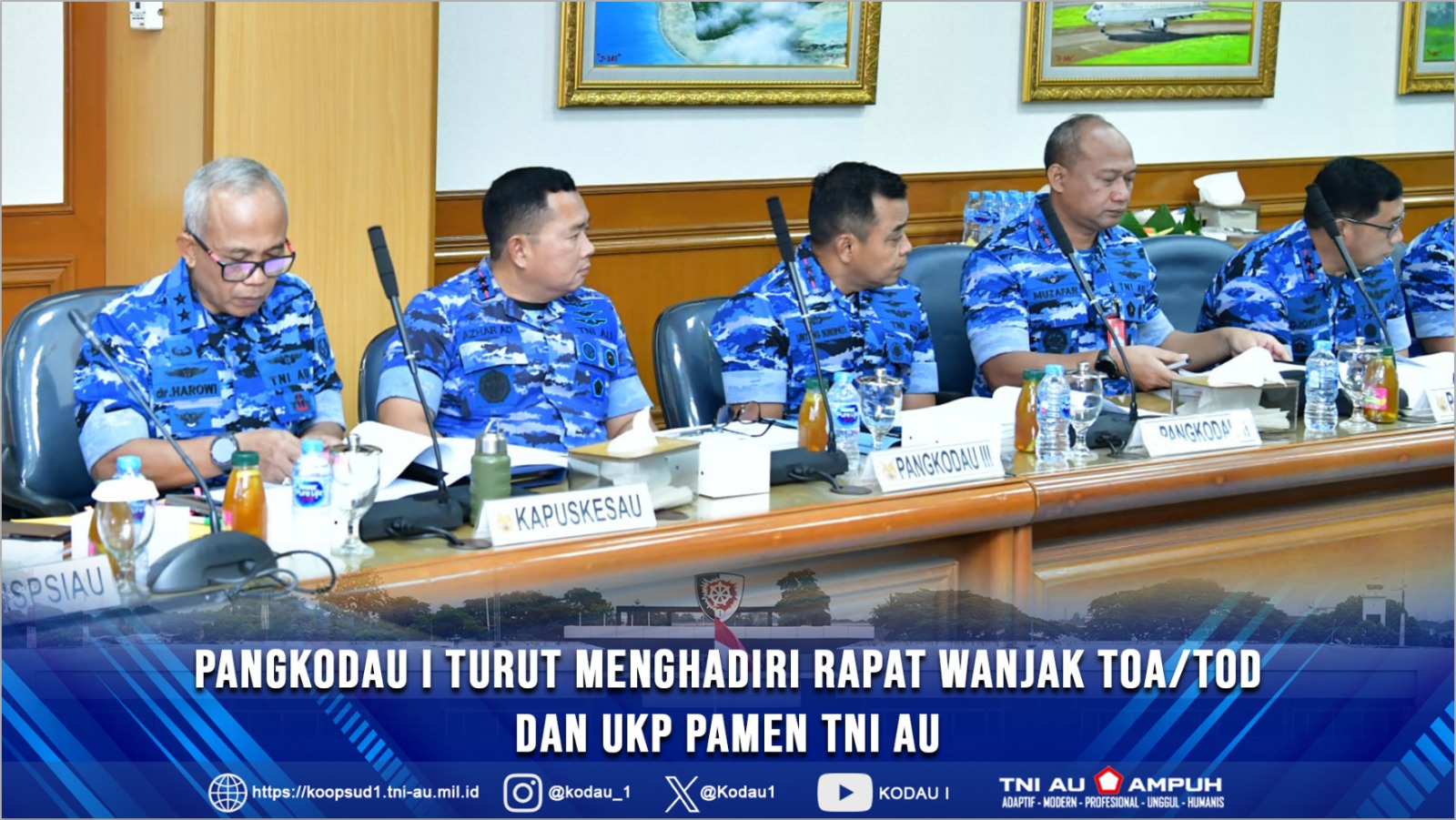 Jakarta – Penkodau I. Panglima Kodau I Marsda TNI Muzafar S.Sos., M.M., turut menghadiri kegiatan Rapat Wanjak TOA/ TOD dan UKP Pamen TNI AU Periode April 2026, yang dipimpin oleh Wakil Kepala Staf Angkatan Udara (Wakasau Marsdya TNI Ir. Tedi Rizalihadi S., M.M., Rapat dilaksanakan selama dua hari, 18-19 Februari 2026,bertempat di Ruang Rapat Wakasau, Mabesau, Cilangkap, Jakarta Timur.