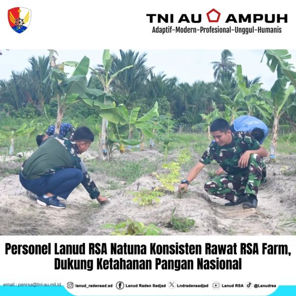 Pangkalan TNI AU Raden Sadjad (Lanud RSA) Natuna terus menunjukkan komitmennya dalam mendukung ketahanan pangan nasional melalui perawatan RSA Farm, yang mencakup sektor pertanian, peternakan dan perikanan. Kegiatan ini dilaksanakan di lingkungan Lanud RSA, Kabupaten Natuna, Provinsi Kepulauan Riau, Senin (7/7/2025).