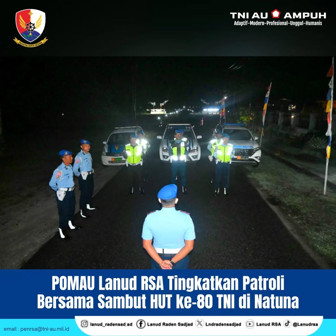 Dalam rangka memperingati HUT ke-80 TNI, Polisi Militer TNI AU (POMAU) Lanud Raden Sadjad melaksanakan patroli bersama di wilayah Natuna, Provinsi Kepulauan Riau, pada Sabtu (4/10/2025) malam.
