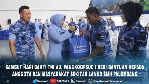 Palembang, Penkoopsud I. Dalam rangka menyambut peringatan ke-76 Hari Bakti TNI Angkatan Udara, Pangkoopsud I Marsda TNI Bambang Gunarto, S.T., M.M., M.Sc., berikan 500 paket sembako kepada anggota dan masyarakat Palembang, yang digelar di Lanud Sri Mulyono Herlambang (Lanud SMH), Palembang, Sumatera Selatan. (Kamis, 27-07-2023).
