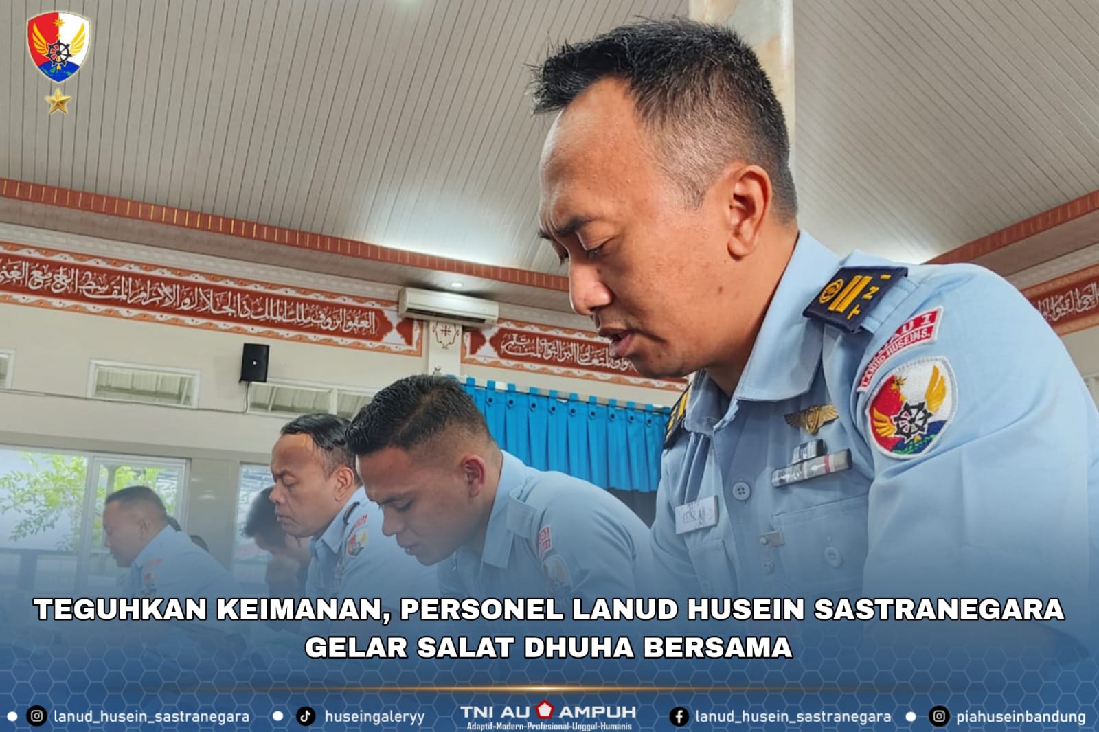 Pelaksanaan salat Dhuha berjamaah dipimpin oleh Kaurbinroh Bintal Lanud Husein Sastranegara, Kapten Sus Sakha Fathul Karim, S.Pd., dan dilanjutkan dengan doa bersama untuk keselamatan dan kesuksesan pelaksanaan tugas, serta kelancaran kegiatan satuan.